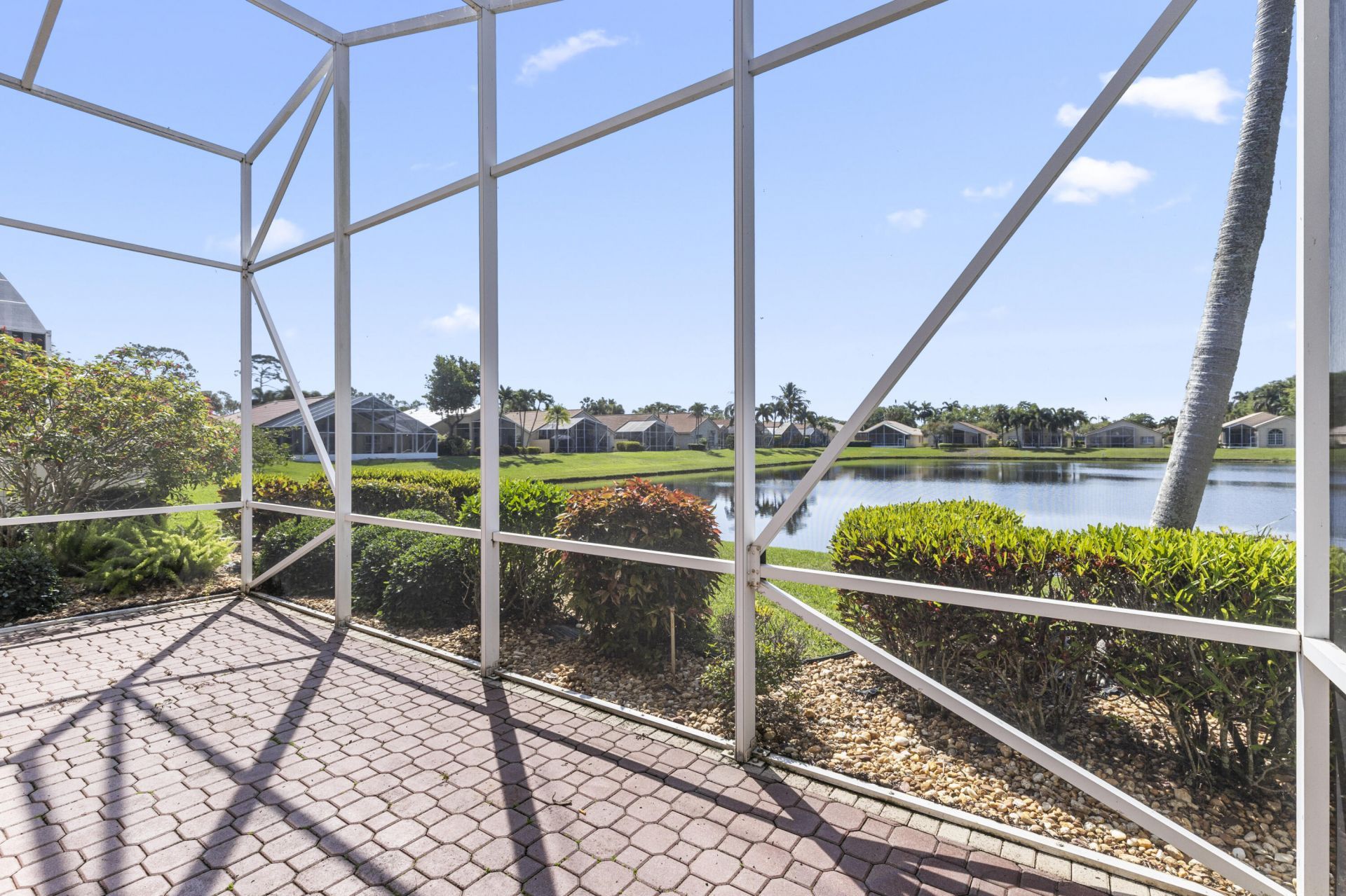 Beautiful home with an even better view! Enjoy a clean and updated interior with high ceilings, water views, fully replaced tile roof 4.5 years old for long enjoyment. The large master suite offers multiple closets and a huge bathroom. Step outside to a covered, screened-in paver patio with a nice lake breeze designed for relaxing. Accordion shutters on all windows offer built-in protection. Palladium is a desirable gated community that welcomes all ages, residents enjoy included landscaping, ca...Beautiful home with an even better view! Enjoy a clean and updated interior with high ceilings, water views, fully replaced tile roof 4.5 years old for long enjoyment. The large master suite offers multiple closets and a huge bathroom. Step outside to a covered, screened-in paver patio with a nice lake breeze designed for relaxing. Accordion shutters on all windows offer built-in protection. Palladium is a desirable gated community that welcomes all ages, residents enjoy included landscaping, cable and internet, along with great amenities like a resort style heated/chilled pool and spa, Har-Tru tennis and pickleball courts, billiards, a clubhouse reservable for events, fitness center, and social calendar. Centrally located, there's great value and a great neighborhood here. Beautiful home with an even better view!
